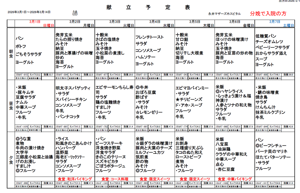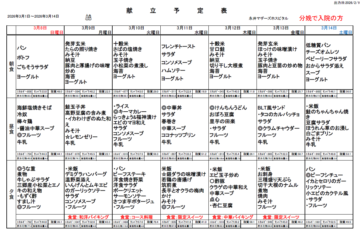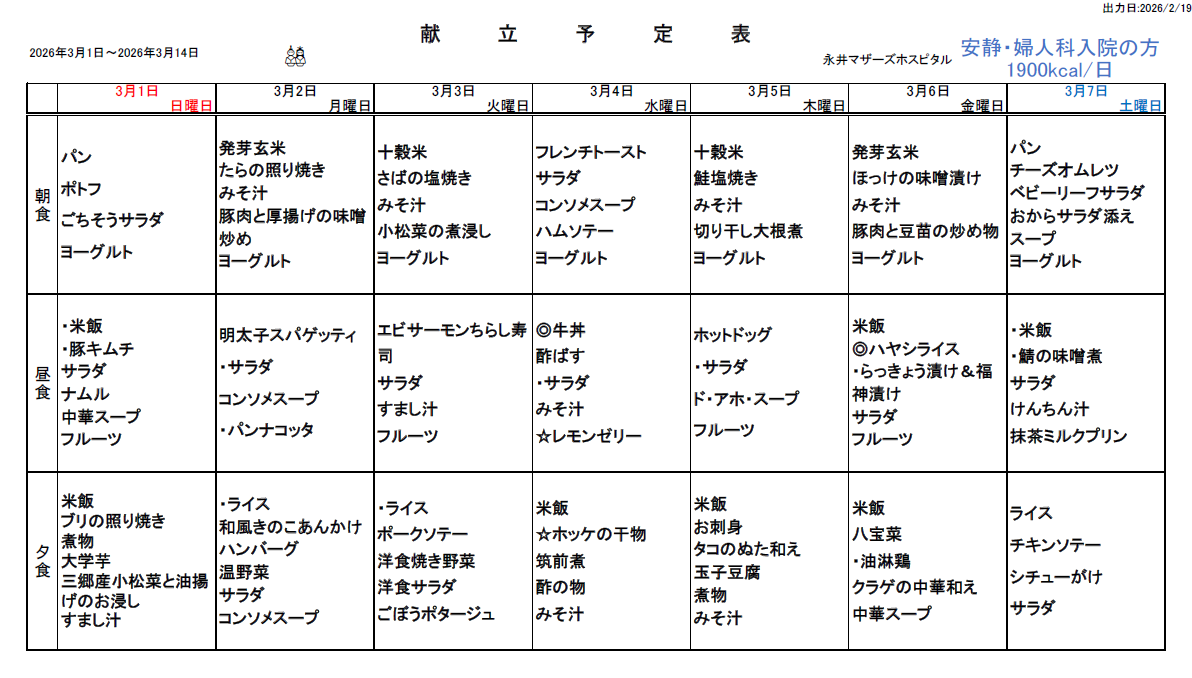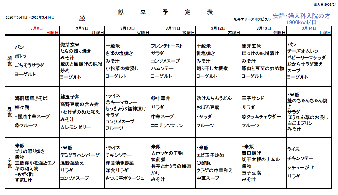 3月1日(日)~3月14日(土)週間献立表