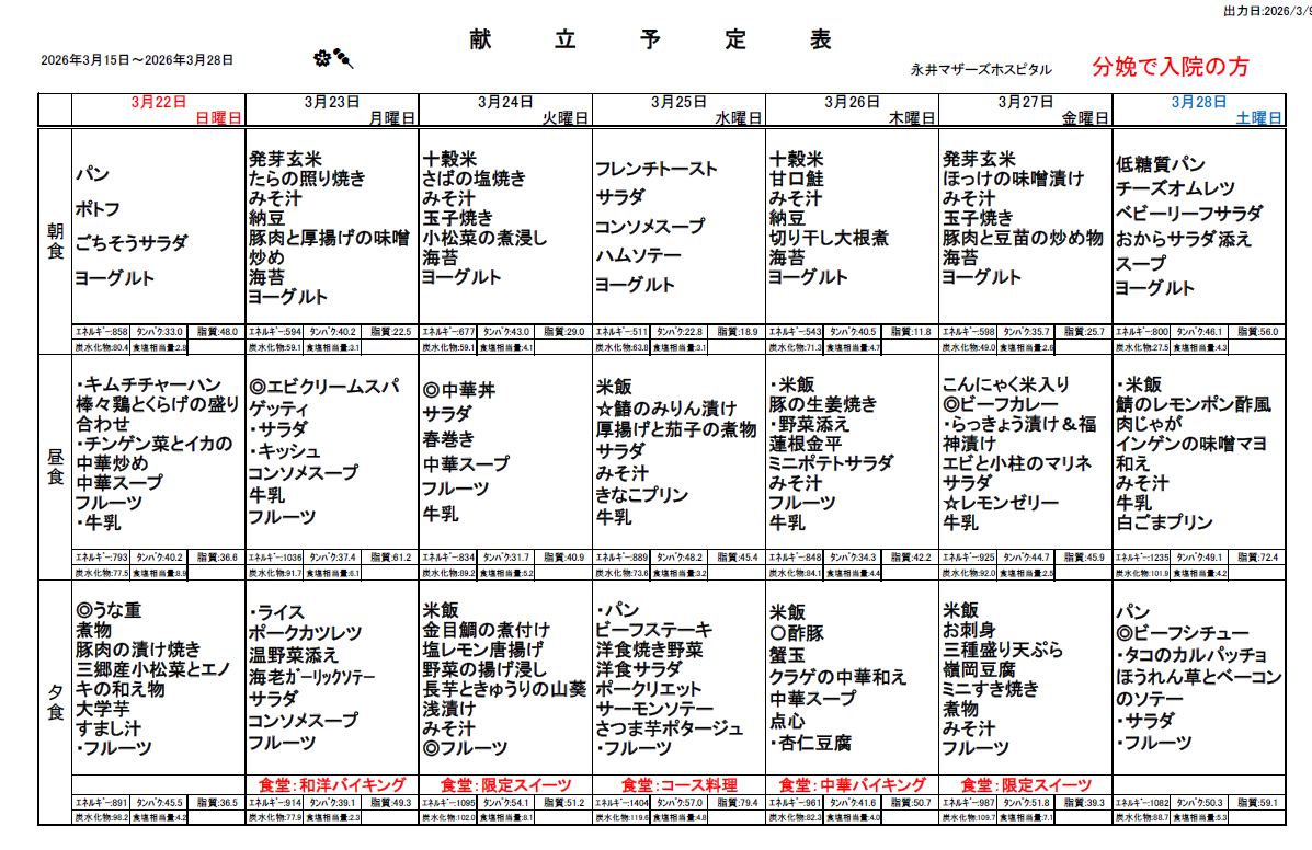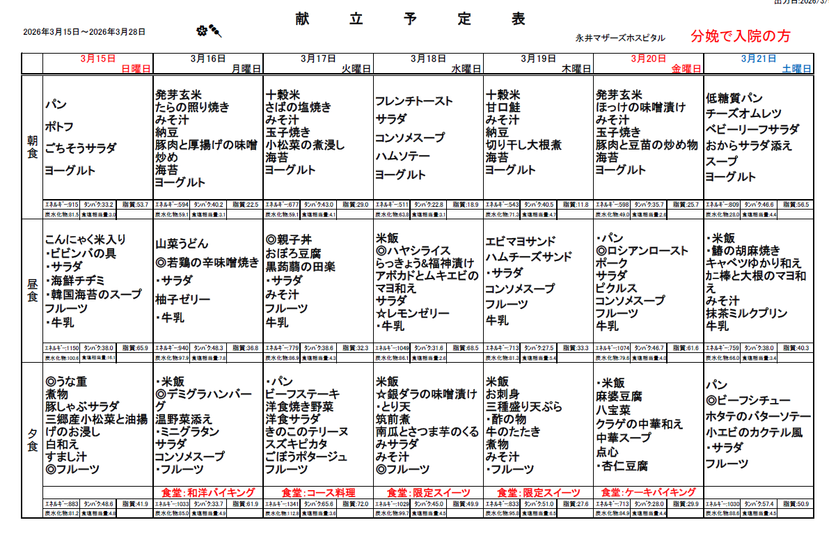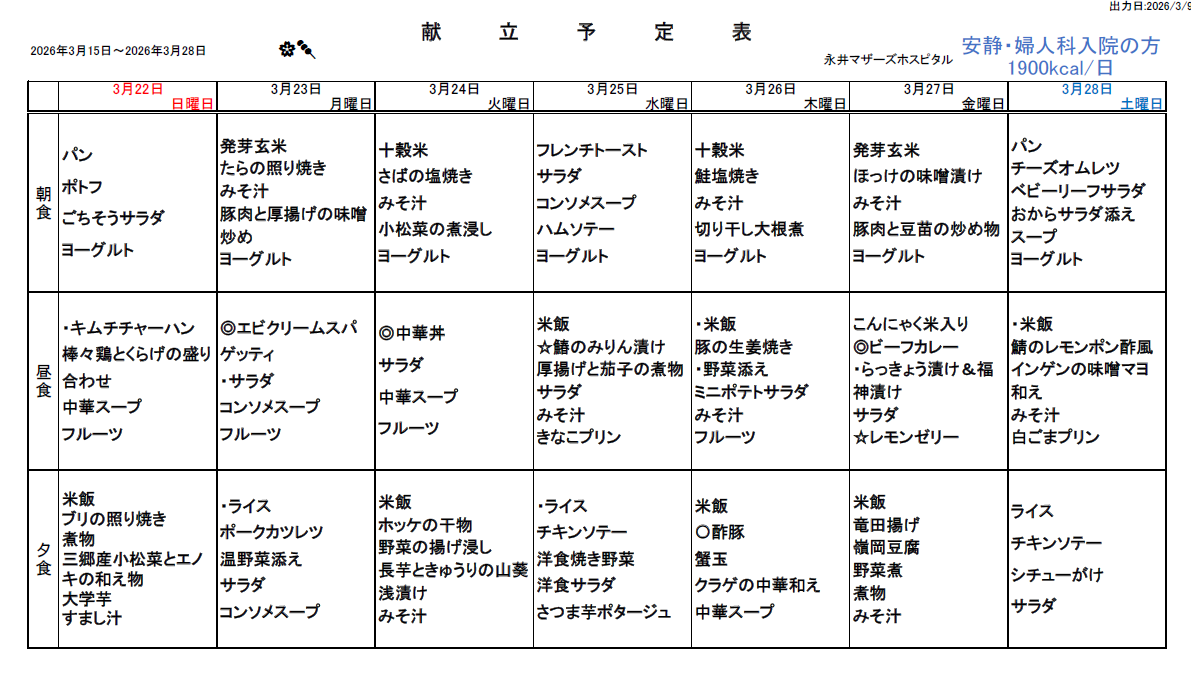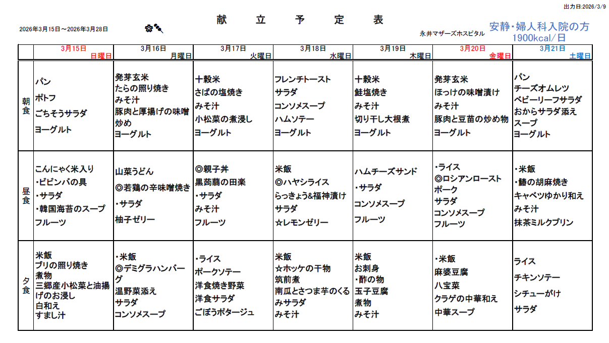 3月15日(日)~3月28日(土)週間献立表