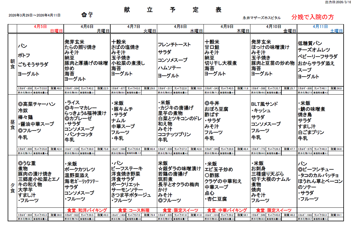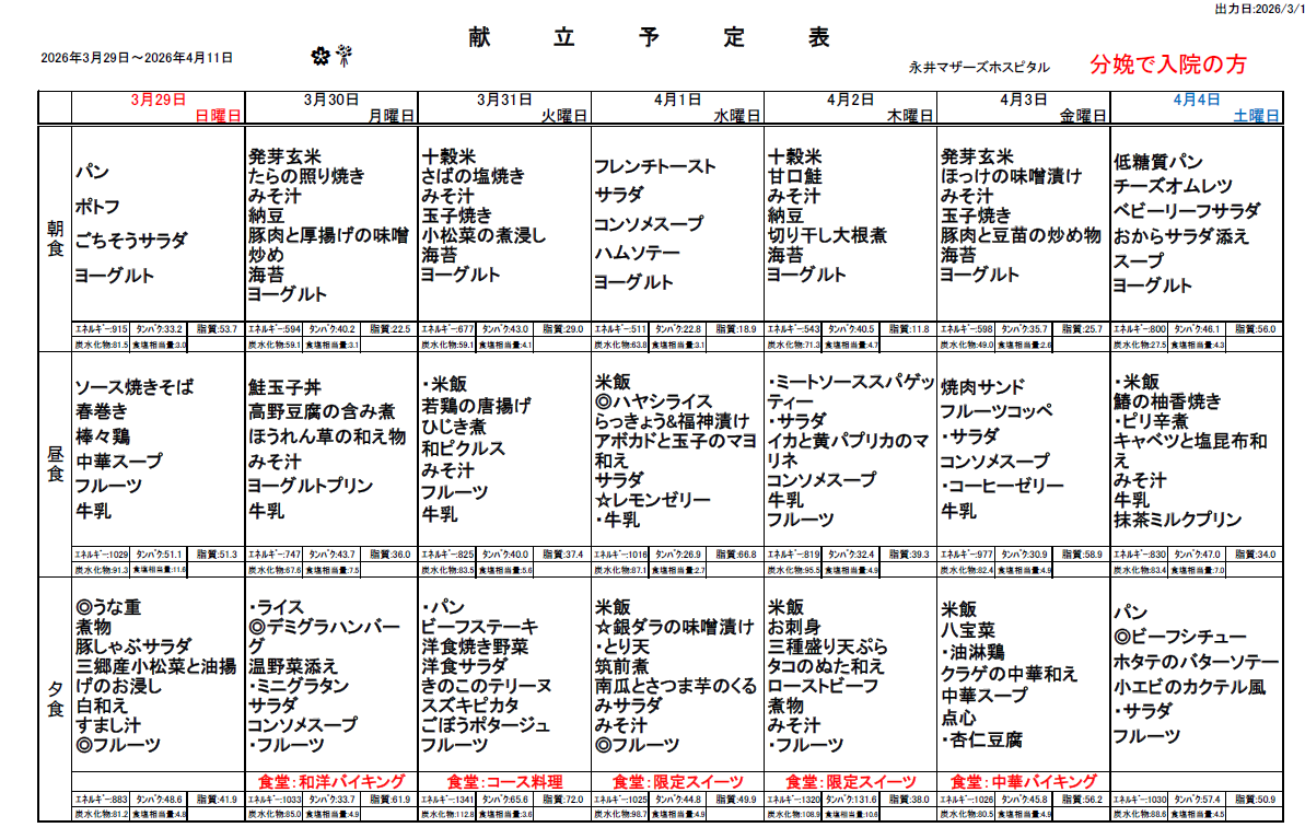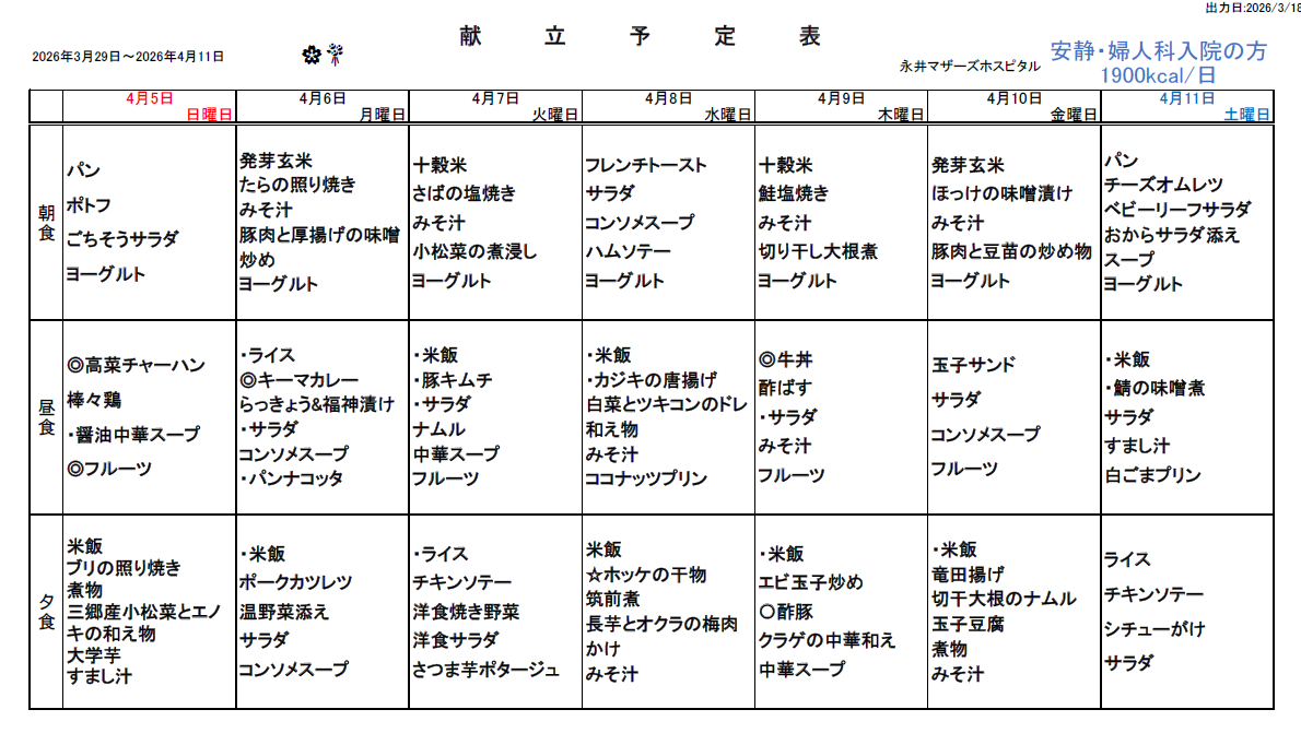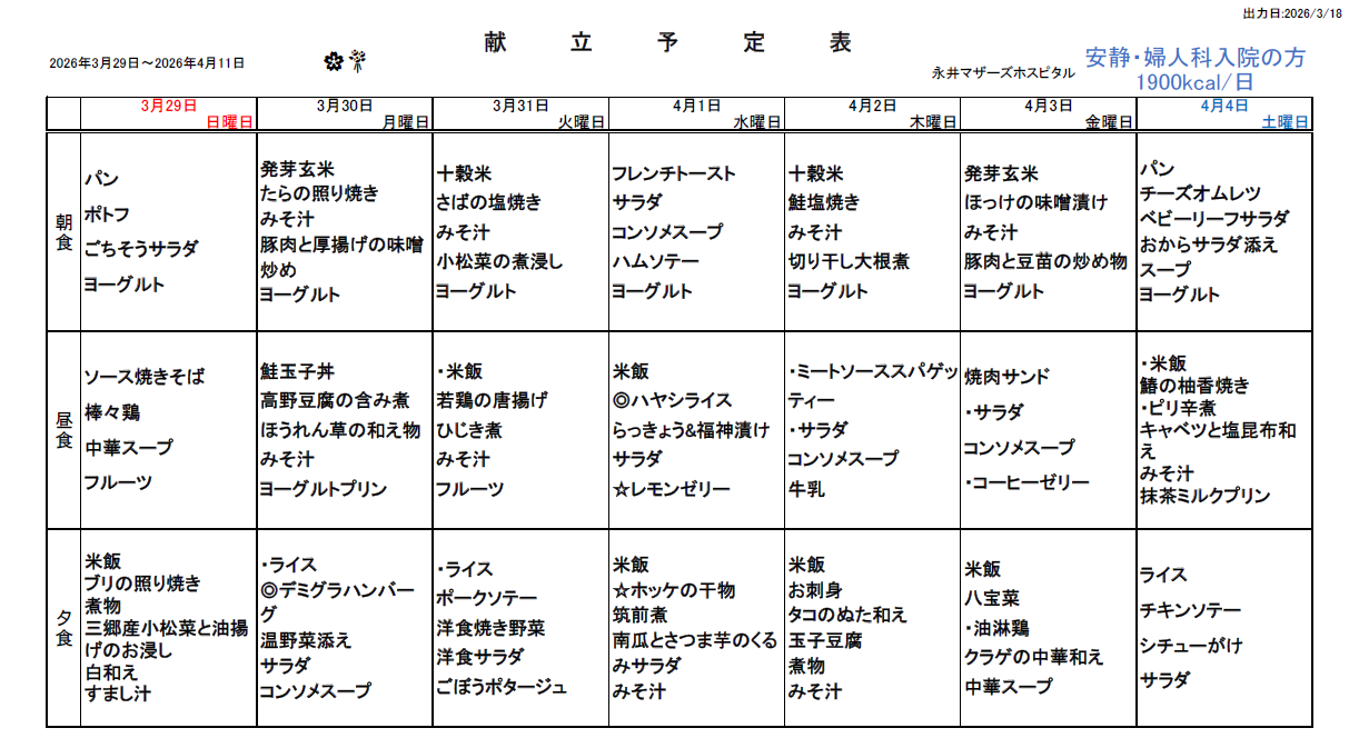3月29日(日)~4月11日(土)週間献立表