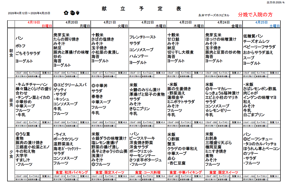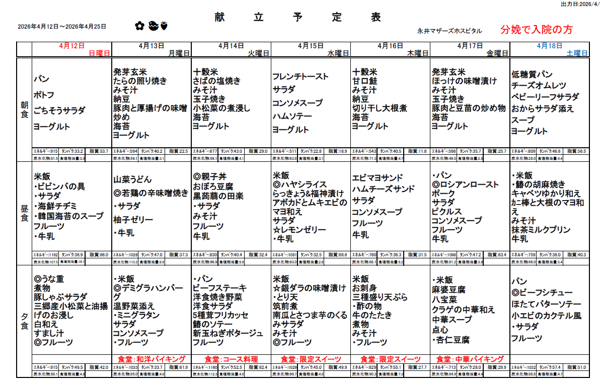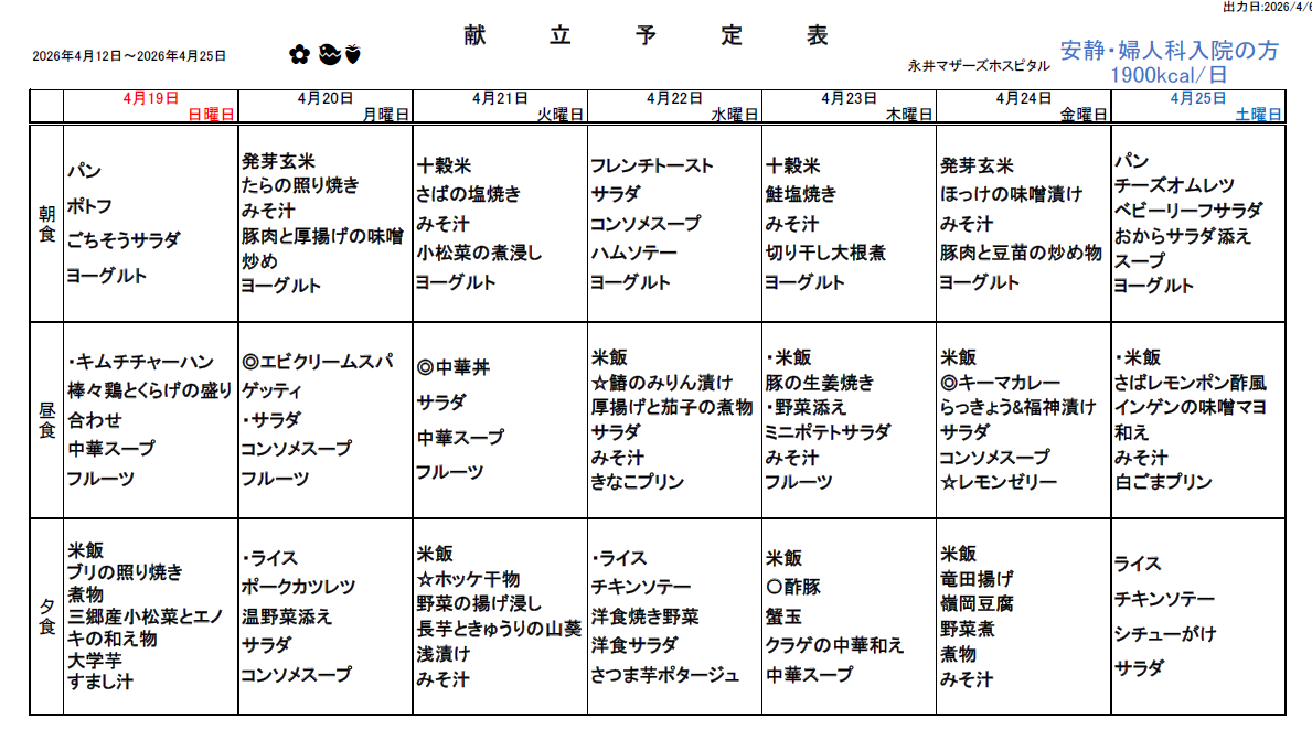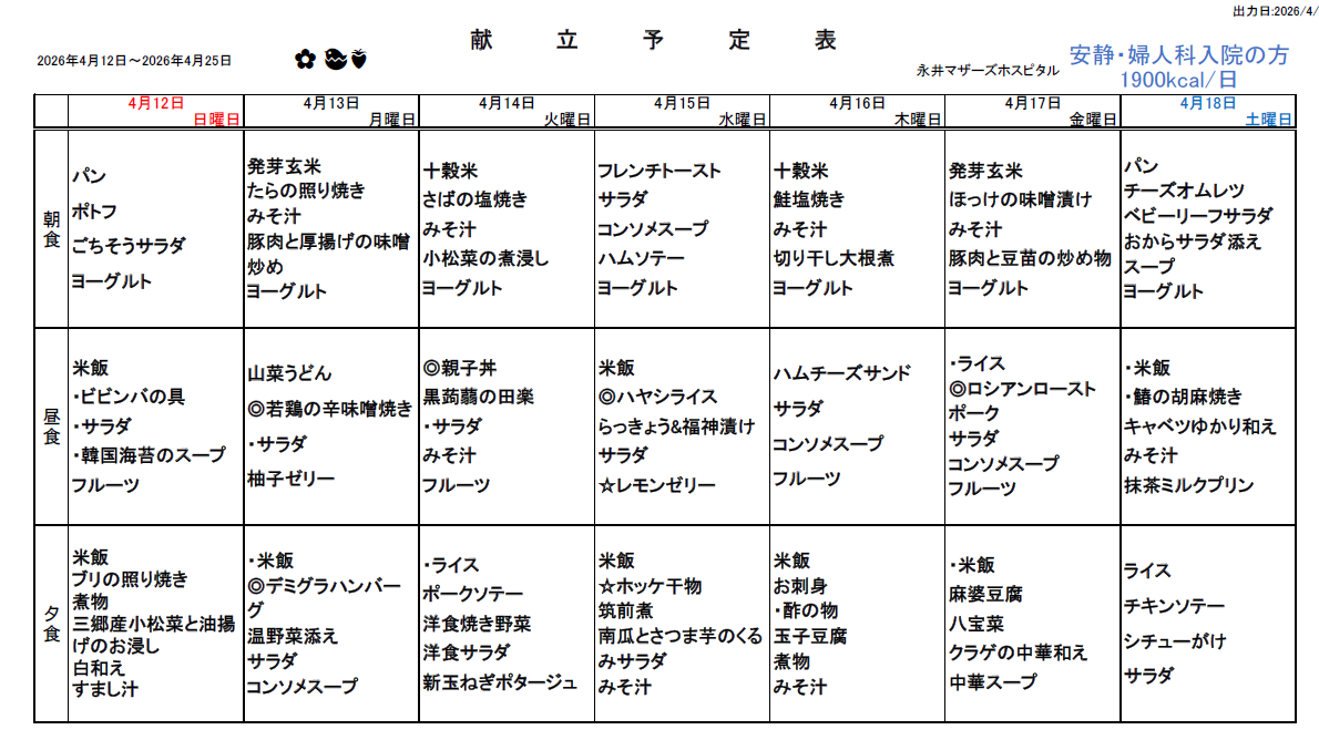 4月12日(日)~4月25日(土)週間献立表