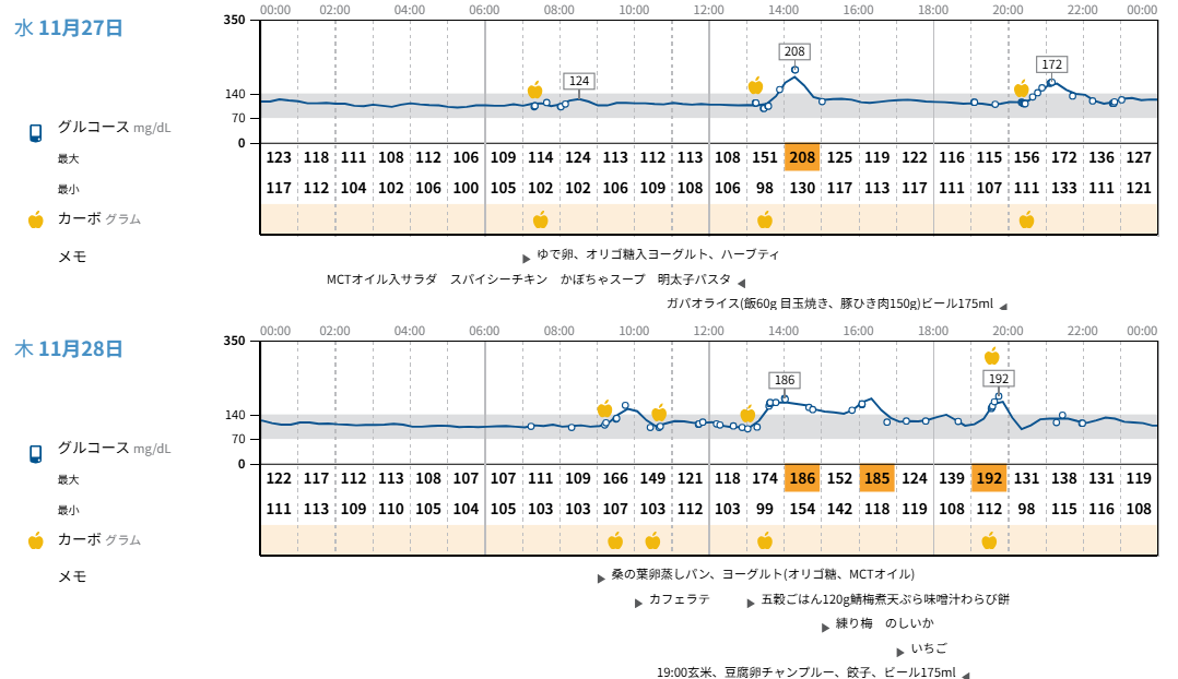 持続血糖測定器(リブレ)を装着し、その結果をもとに食事のアドバイスを実施。