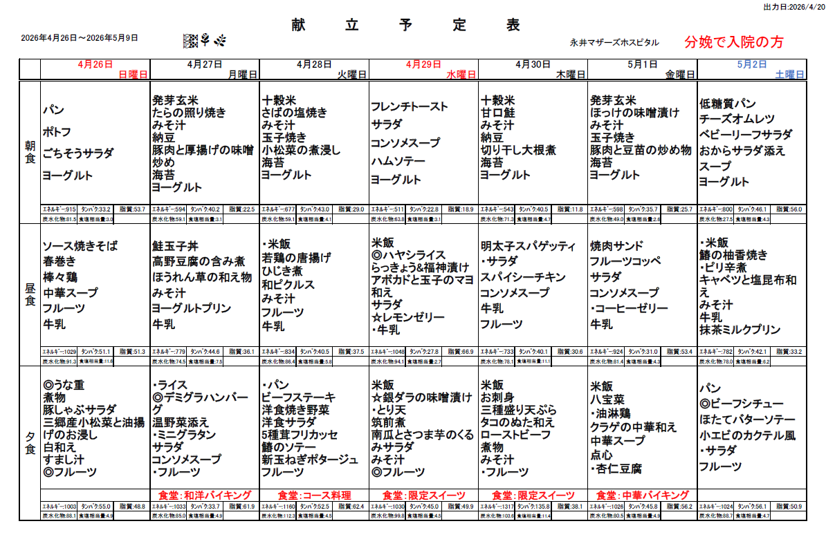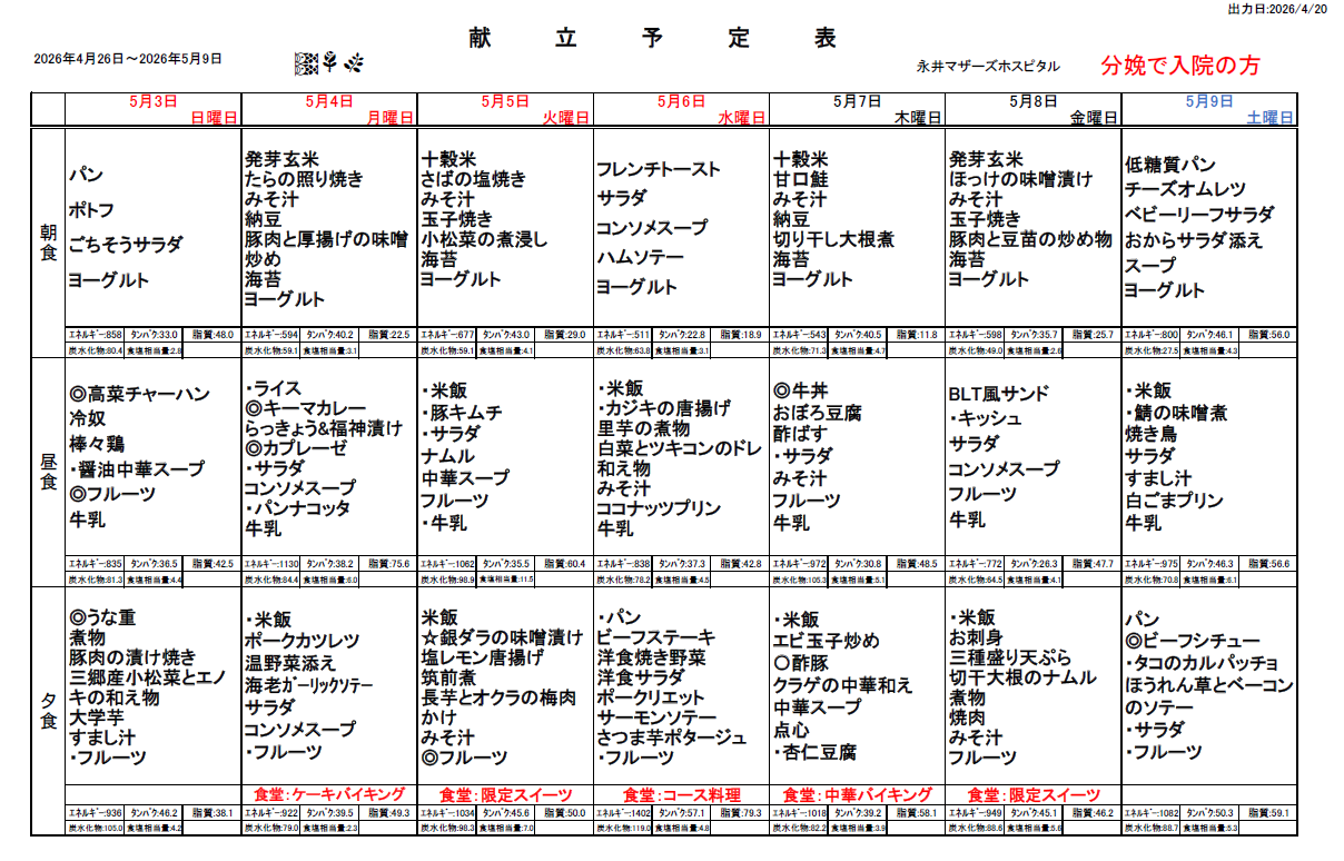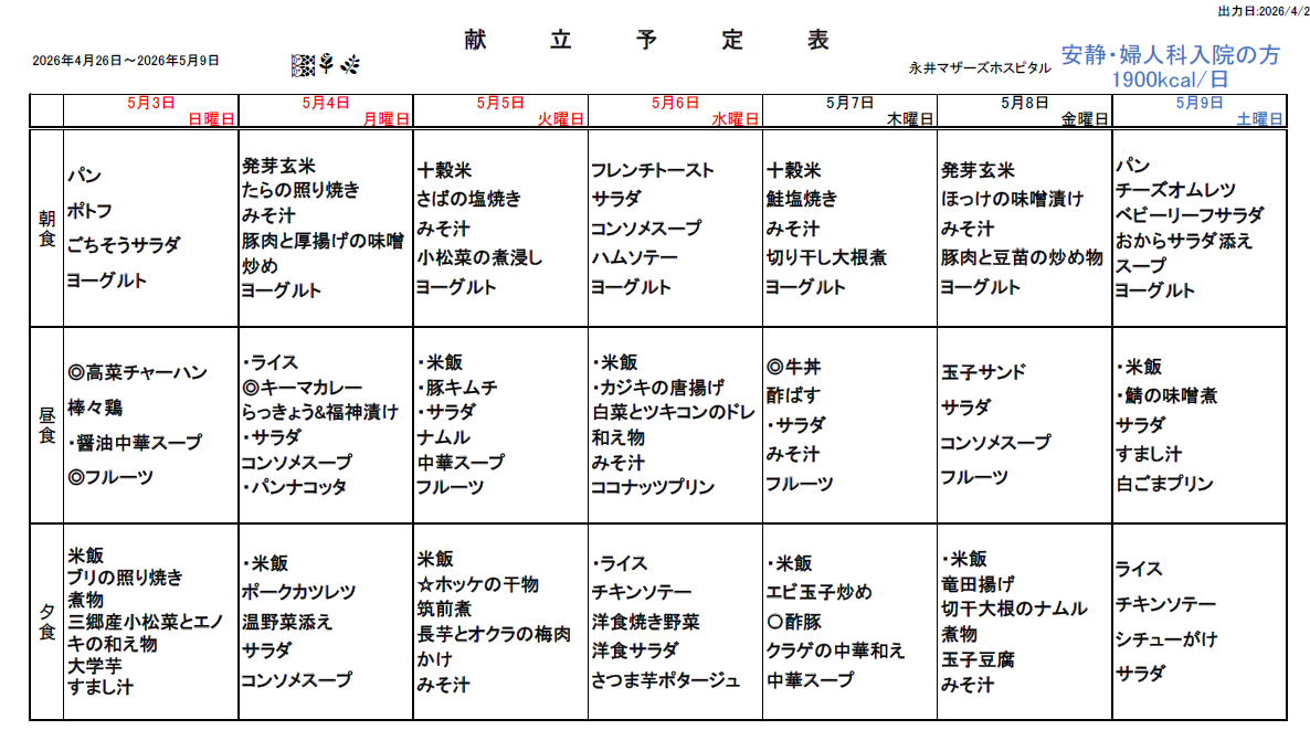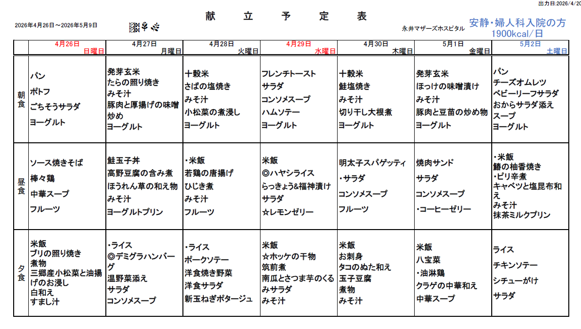 4月26日(日)~5月9日(土)週間献立表