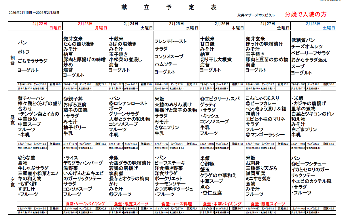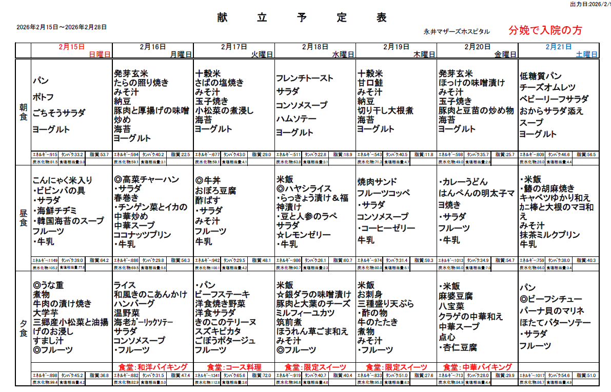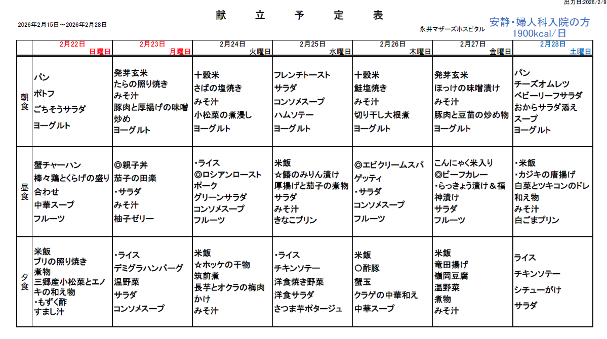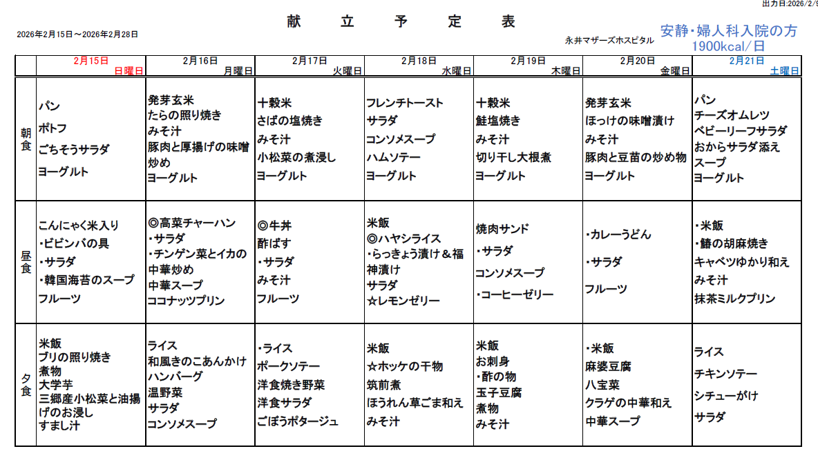 2月15日(日)~2月28日(土)週間献立表